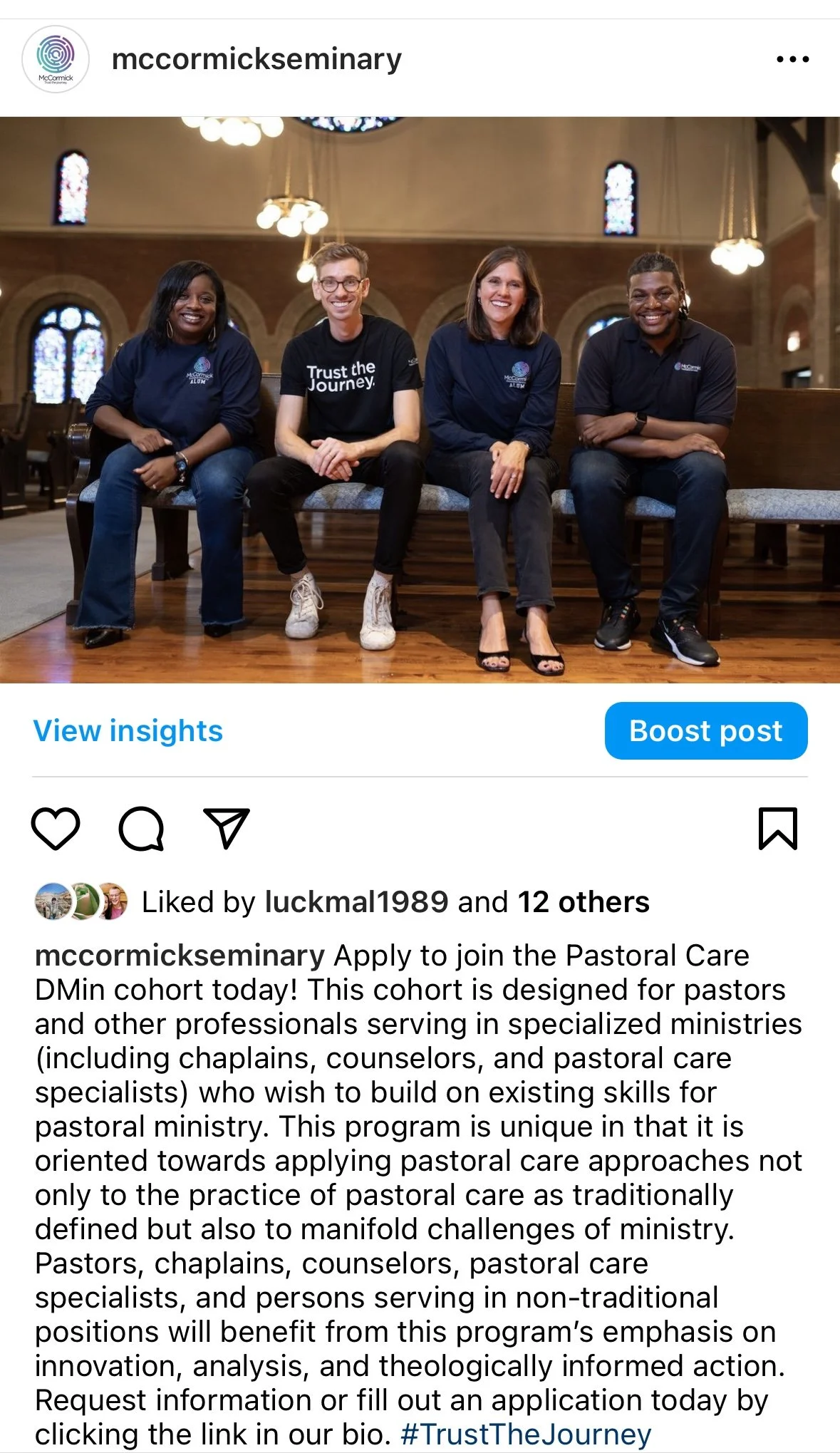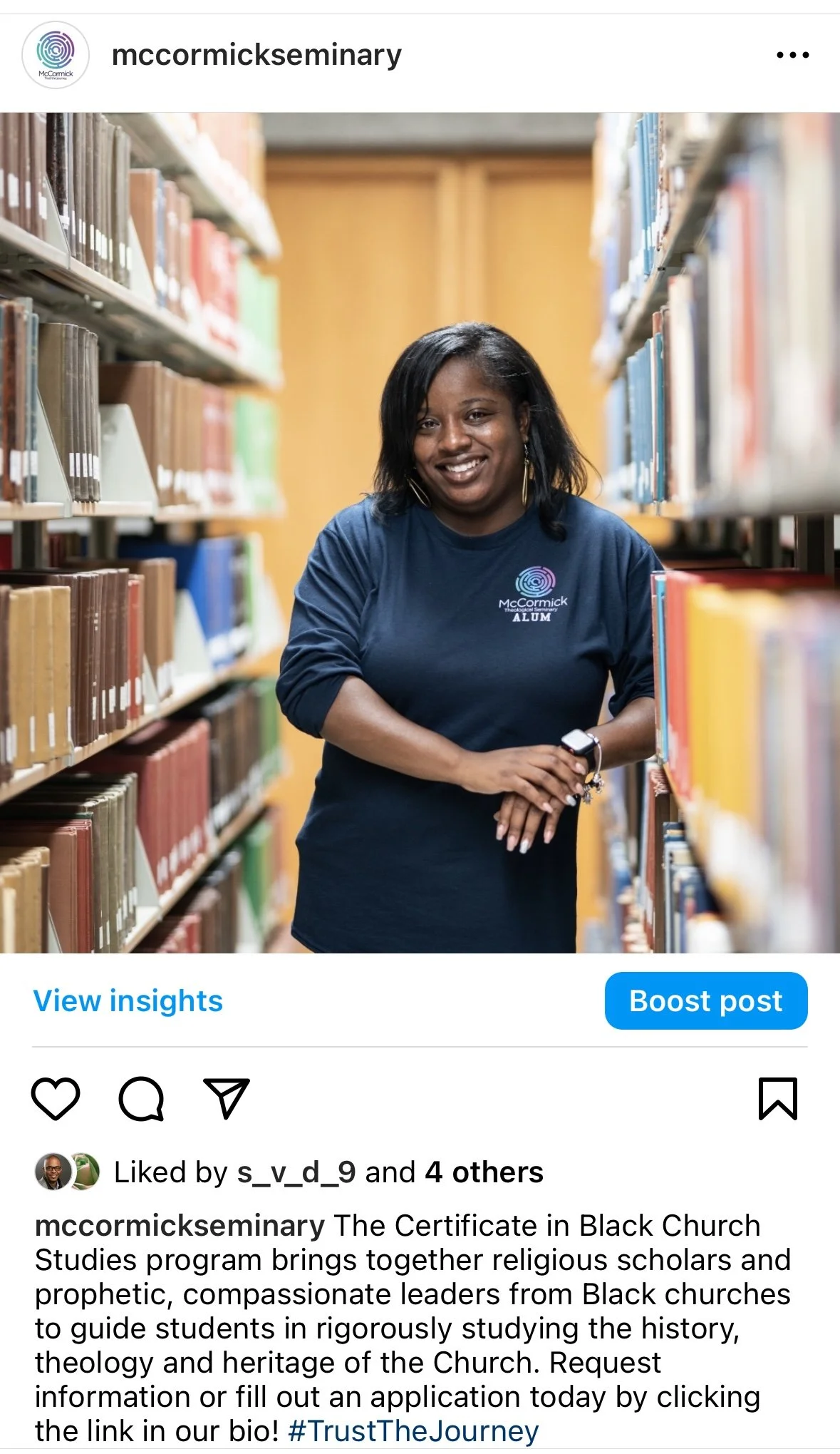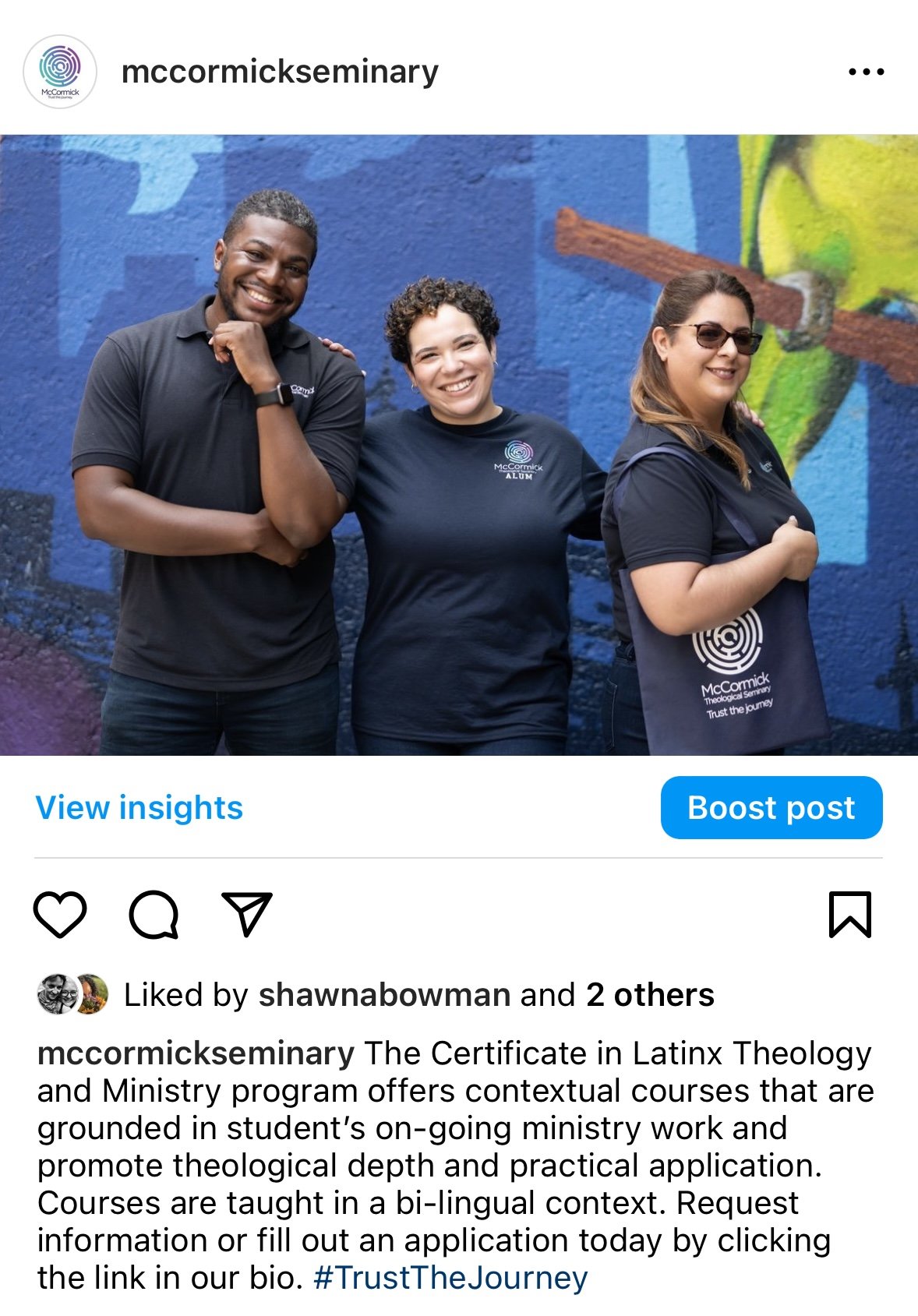 McCormick Theological Seminary strives to provide a transformational, accessible, and affordable educational experience where the Christian faith, diverse perspectives, curiosity, and creativity intersect to enrich leaders for the practice of ministry. As social media manager, the goal is to create posts that depict the depth and details of our programming as well as showcasing McCormick’s branding. I planned, coordinated and oversaw a branded photoshoot specifically for our social media posts for our degree programs, as well as branded photos for other social media posts.